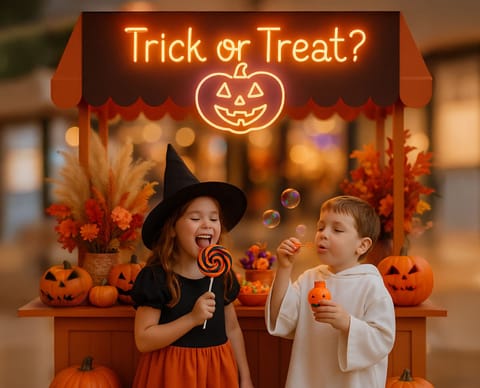 Nei giorni più magici, hostess in costume animeranno il chiosco per uno speciale dolcetto o scherzetto, con caramelle e bacchette di bolle di sapone per i bambini.